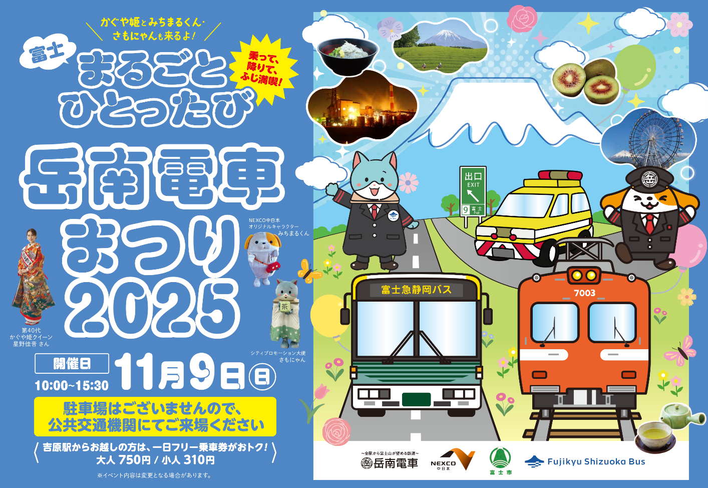岳南鉄道線「岳南江尾」駅前をメイン会場に、「岳南富士岡」駅前を合わせ2会場にて「岳南電車まつり2025」を開催します。詳細は随時更新します。