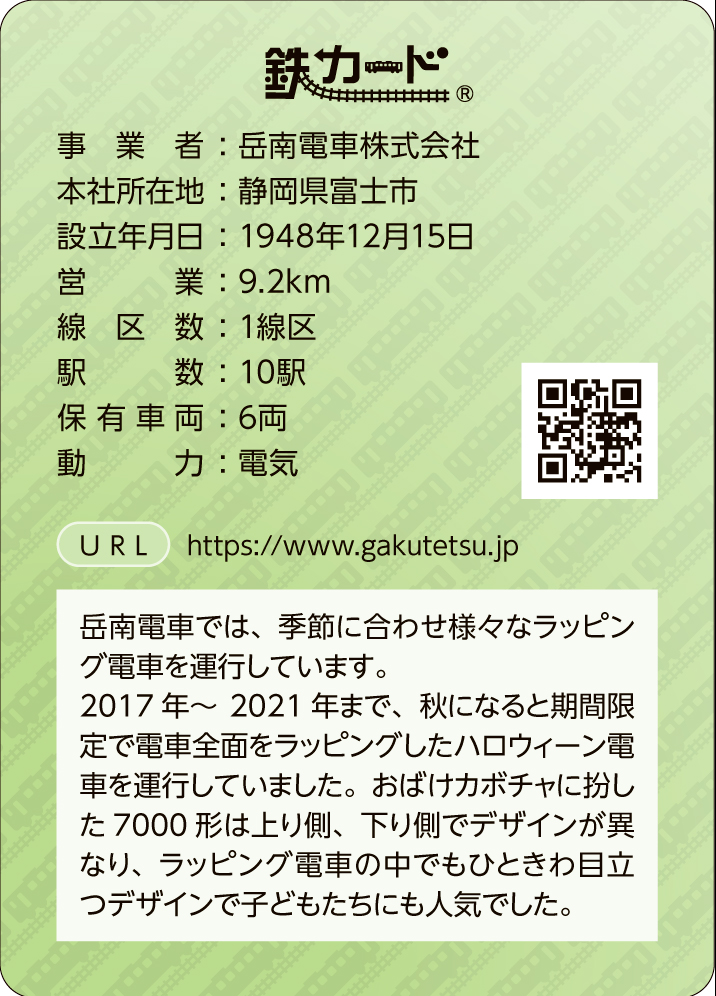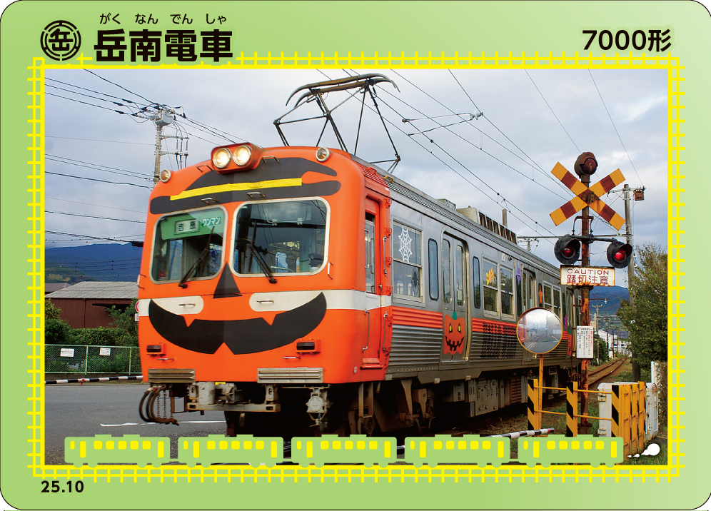 今回は秋らしいハロウィンラッピング電車のデザイン。ぜひ、岳南電車の鉄カードをコレクションしてみてください!